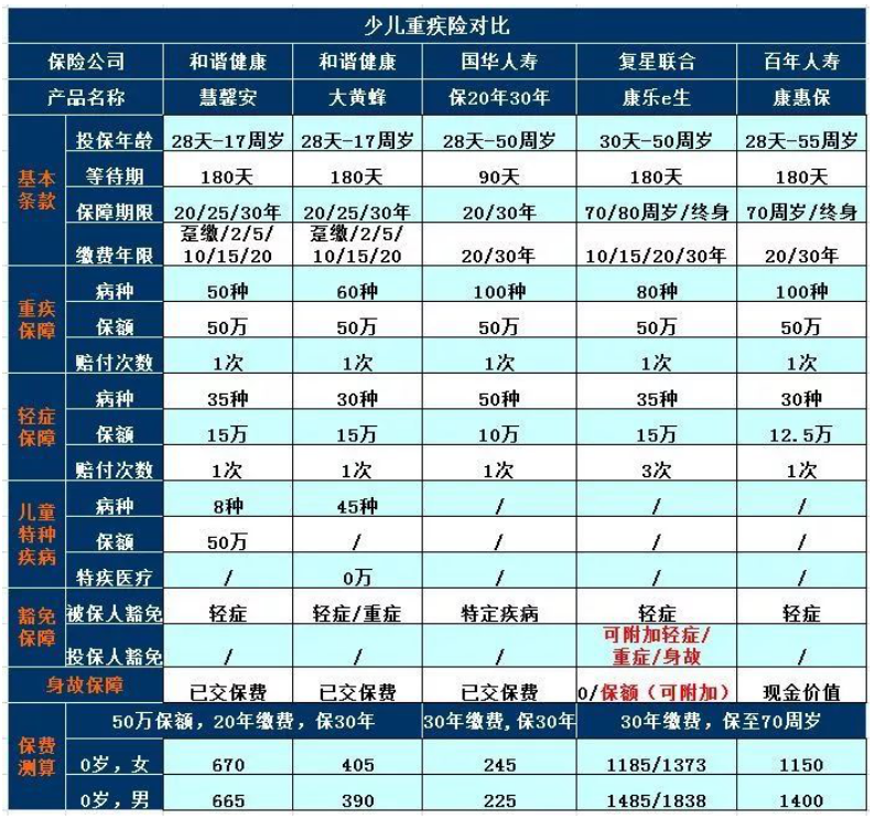 為了方便大家,我們將兒童的重大疾病保險與市場上的高性價比進行了比較。有幾種模型并不專門針對兒童的特定嚴重疾病,但保障也非常全面,如下: