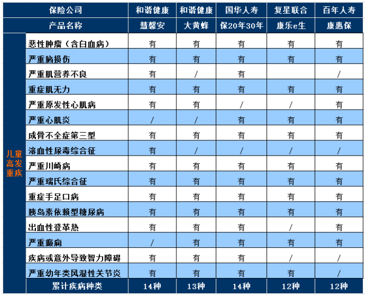 由于沒有統(tǒng)一的標準,兒童特定嚴重疾病的分類并不統(tǒng)一。對于嚴重程度高和病情嚴重的兒童,上述產(chǎn)品與保障進行比較如下: