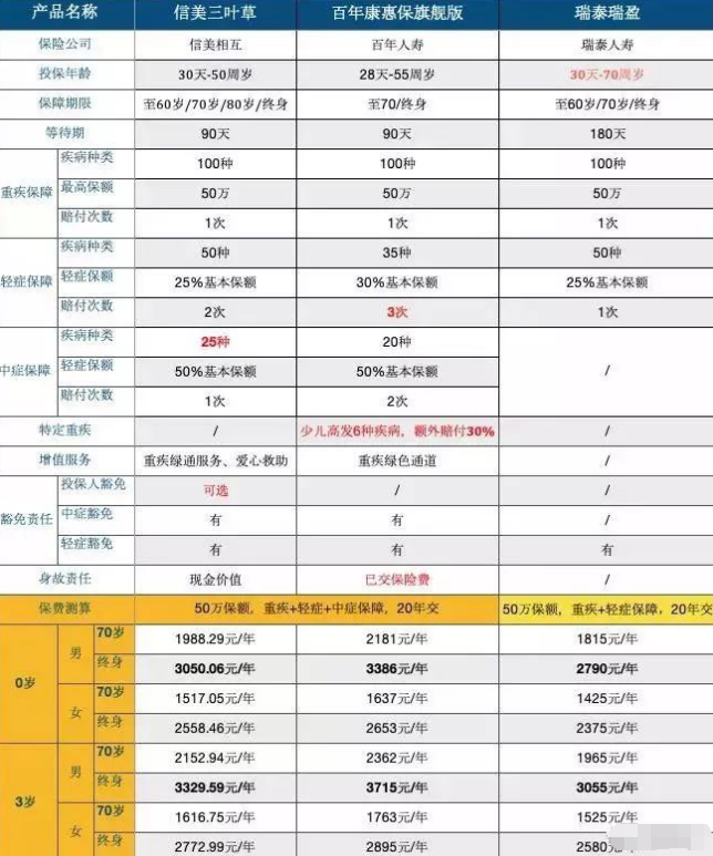 首先看看信美三葉草、百年康惠保旗艦版和瑞泰瑞盈三款長期重大疾病保險評估: