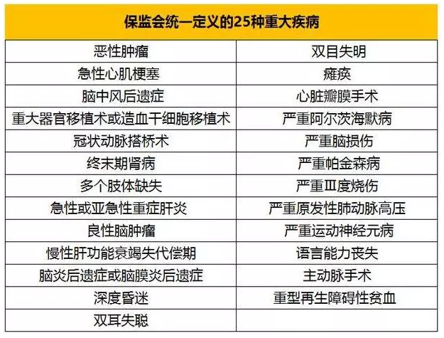 2007年,保險(xiǎn)業(yè)協(xié)會一致制定《重大疾病保險(xiǎn)的疾病定義使用規(guī)范》,統(tǒng)一各大保險(xiǎn)公司的疾病。因此,無論是50種嚴(yán)重疾病還是100種嚴(yán)重疾病,前25種保險(xiǎn)公司的定義都是相同的。