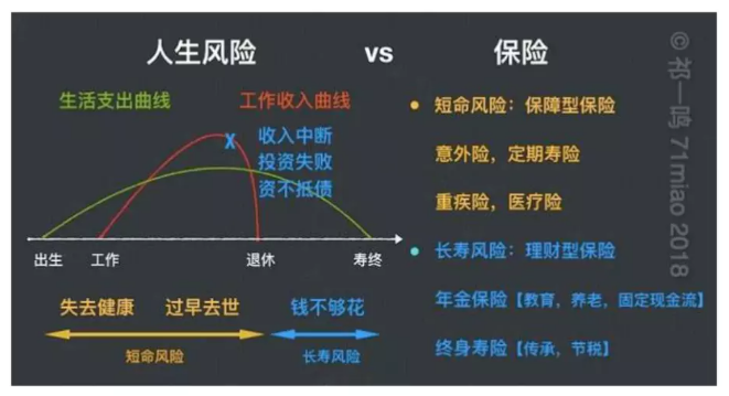 看第一張圖,綠線是支出曲線。在這一生中,人們在老了病的時(shí)候不得不花錢。如果退休后收入不夠,或者因?yàn)槭I(yè)、投資失敗,這筆錢還不夠。我們稱之為長壽風(fēng)險(xiǎn)。它對(duì)應(yīng)于金融保險(xiǎn),例如最常見的年金保險(xiǎn)和終身壽險(xiǎn)。