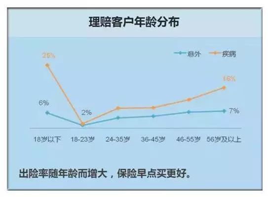 1、保費是隨年齡變化的。成年人越老,保費越高。下圖是2017年理賠報告中的太平洋理賠客戶年齡分布表,很明顯理賠年齡與費率上升法基本相同。