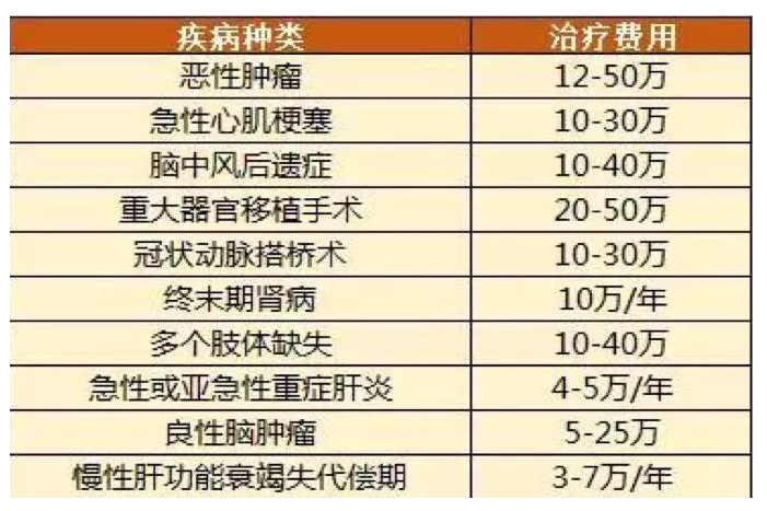 我有一張表詳細說明了一些主要疾病的治療費用。實際上,我想我必須購買至少500,000。我朋友的妻子得了良性腦腫瘤。她住在ICU醫(yī)院兩個月,花了70萬。我聽說家里人開始賣房了。我不知道什么時候是頭。我無法想象發(fā)生在我身上的感覺。醫(yī)療費,房屋貸款,孩子的學費和家里的日常開支,以及后續(xù)康復的錢都是無底的。在這里,我們必須向每個人澄清一個概念,即重大疾病保險不僅是醫(yī)療費用,還包括康復護理的費用和家庭收入損失的部分。
