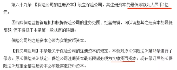 讀完之后,每個(gè)人基本都明白,如果你想開一家保險(xiǎn)公司,注冊(cè)資本至少有2億現(xiàn)金。同時(shí),國(guó)務(wù)院保險(xiǎn)監(jiān)督管理機(jī)構(gòu)可以根據(jù)保險(xiǎn)公司業(yè)務(wù)范圍、經(jīng)營(yíng)規(guī)模調(diào)整其注冊(cè)資本的最低金額,但不得低于本條第一款規(guī)定的限額。 保險(xiǎn)公司的注冊(cè)資本必須是實(shí)收的貨幣資本。