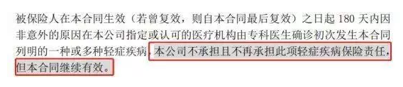 這意味著保險單在等待期間確認(rèn)為輕癥,而保險公司此時不是理賠,而是輕癥,但不會取消合同。如果發(fā)生輕癥并且合同終止,則不僅意味著理賠,而且將來也意味著保障。雙保護(hù)條款非常人性化,雖然這次輕癥不是賠付,但是合約沒有結(jié)束,保障總是存在的。